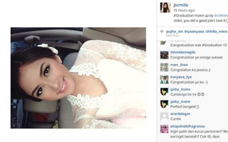 Jessica Mila memposting foto busana yang dikenakannya kala hari wisuda, di dalam foto tersebut, ia selfie seorang diri tanpa memakai toga wisuda, busana wisuda Jessica pakai merupakan stelan kebaya bernuansa putih dan elegan. Riasan natural terlihat mempercantik wanita yang kini tengah naik daun tersebut.