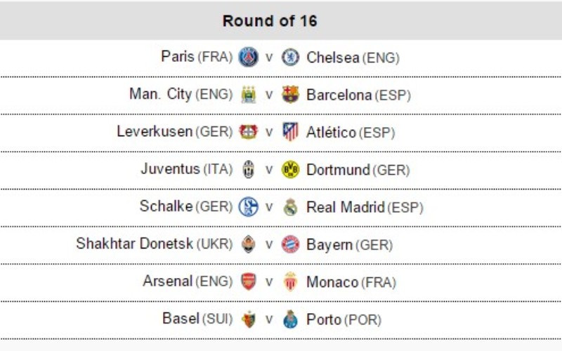 Pertandingan seru terlihat dari hasil drawing babak 16 besar Liga Champions 2014, diantaranya Barcelona vs Manchester City dan PSG vs Chelsea dan laga Juventus vs Borussia Dortmund.