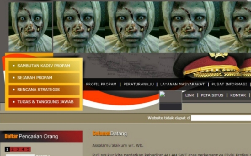 RANCAH POST – Sosok gambar pocong berwajah seram muncul di situs resmi Divisi Profesi dan Pengaman Mabes Polri. Gambar horor tersebut dipajang tepat di bagian banner depan situs www.propam.polri.go.id.