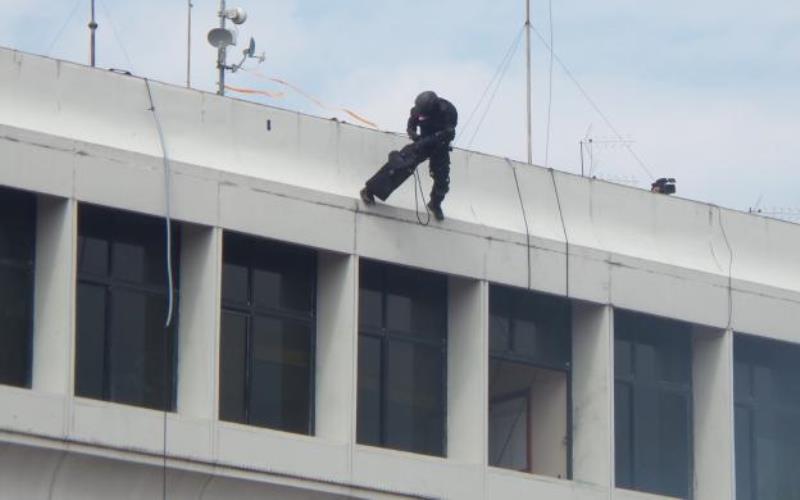 Ketika hampir semua anggota sudah siaga dalam posisi masing-masing, seorang anggota pasukan Satgultor nampak masih menggantung di atas gedung. Dia spertinya kesulitan menguraikan tali untuk bisa meluncur ke bawah.