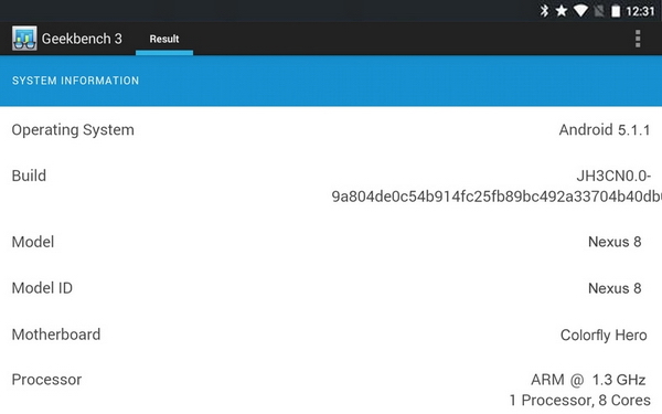 Informasi yang lebih dulu datang juga berupa sebuah gambar. Atau tepatnya sebuah screenshoot dari GeekBench yang tentunya menampilkan data yang diduga kuat merupakan informasi mengenai spesifikasi dari handset Nexus 8 ini.