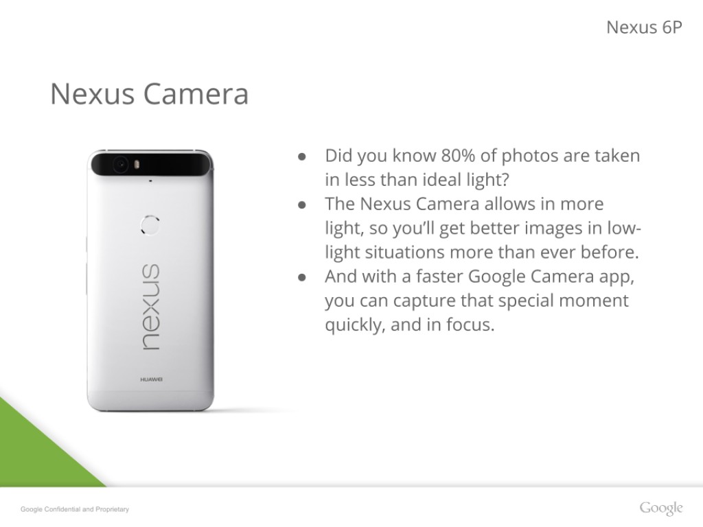 Menurut bocoran slide tersebut, ponsel Huawei Nexus 6P ini bakal menawarkan layar 5,7 inci dengan resolusi 1440 x 2560 piksel, dengan body berbahan logam dan dukungan chipset Qualcomm Snapdragon 810 versi 2.1 di bagian ruang pacu. Ponsel yang memiliki bobot 178 gram ini juga dibekali baterai 3450 mAh yang dipercaya akan mendukung fitur Quick Charge dari Qualcomm dengan speaker depan dan konektor USB tipe-C.