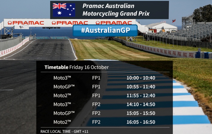 Rencananya hari ini dalam latihan bebas hari pertama MotoGP Australia juga akan melangsungkan sesi free practice kedua (FP2) untuk kelas Moto3 mulai pukul 10.10 WIB, MotoGP yang dimulai dari pukul 11.05 WIB, dan Moto2 mulai pukul 12.05 WIB.