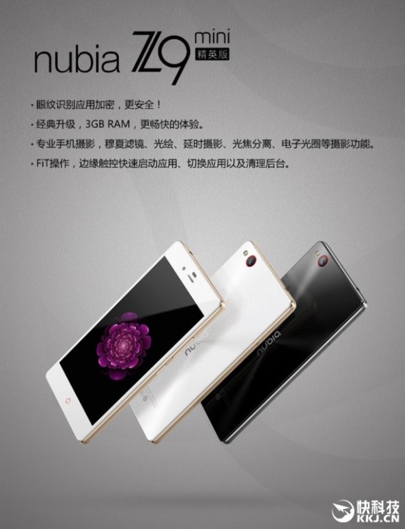 Sementara itu ZTE Nubia Z9 Mini Elite diupgrade RAM-nya menjadi 3GB dari yang sebelumnya hanya 2GB saja. Dengan dukungan fitur eye pattern recognition dan software menarik lainnya. Sisanya masih sama, layar 5 inci dengan resolusi FHD dan kamera 16MP di bagian utama. Tidak lupa pula dengan kamera 8MP di depan. Ponsel ini juga dibekali dengan prosesor Qualcomm Snapdragon 615 dengan 16GB memori internal dan baterai 2900 mAh.