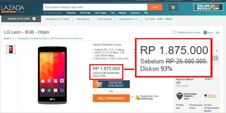 Bukan cuma kasus PS4 saja. Di Lazada Indonesia juga ada penjual nakal yang menawarkan handset LG Leon 8GB Hitam dengan harga senilai Rp1.875.000 setelah mendapat diskon 95%, dari harga normal mencapai Rp25.000.000. Padahal, harga normal LG Leon 8 GB hitam di Lazada Indonesia pada hari biasa sudah bisa didapat mulai Rp1.479.000 saja.