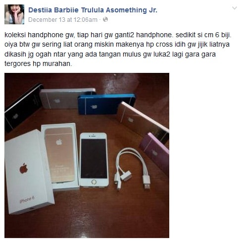 RANCAH POST – Salah satu akun Facebook bernama Destiia Barbiie Trulula Asomething Jr. baru-baru ini tengah hangat diperbincangkan di dunia per-sosmed-an. Betapa tidak, tingkah laku cewek yang mengaku anti cowok miskin ini terlihat sangat konyol, selain itu juga merendahkan orang miskin di Facebook.