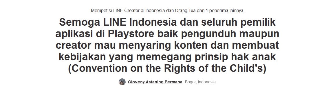 Kegeramannya ini dia ungkapkan dengan membuat sebuah petisi di situ Change.org. Pada petisi tersebut, Gioveny menuliskan bahwa ‘Ia meminta pihak Line Indonesia dan para pemilik aplikasi di PlayStore mau dan mampu menyaring konten dan membuat kebijakan yang menghargai dan memegang prinsip hak anak (Convention on the Rights of the Child’s).’ Hal ini juga berlaku baik bagi para pembuat maupun pengunduh aplikasi.