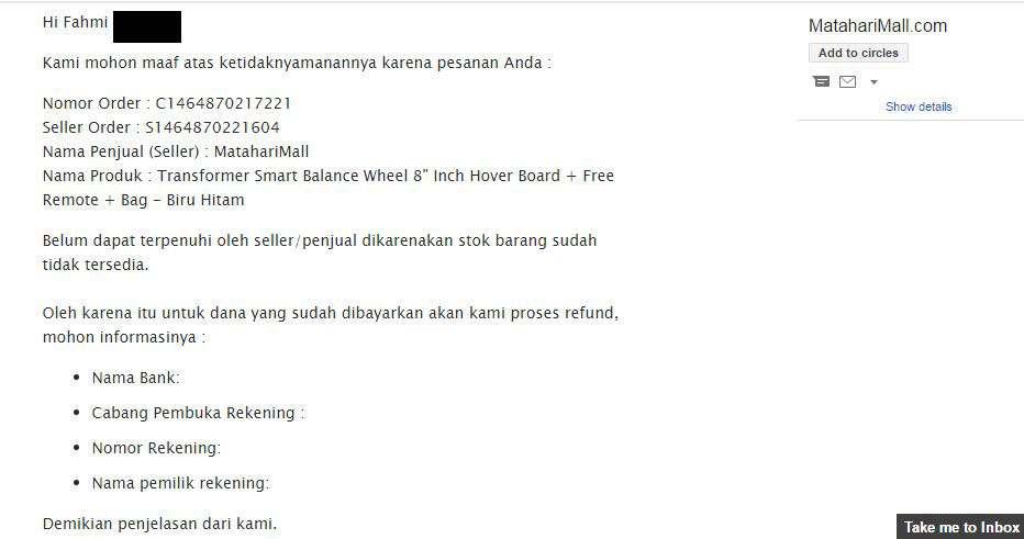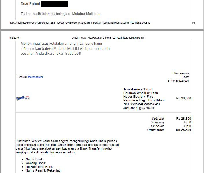 Selang beberapa waktu setelah pembayaran diterima oleh pihak Matahari Mall, netizen ini dikagetkan dengan sebuah email dari MM yang memberitahukan bahwa pemesanan yang telah ia lakukan merupakan FRAUD. Alhasil, uang pembayaran yang sudah dikonfirmasi pun akan direfund oleh pihak Matahari Mall.