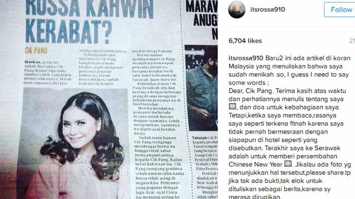 RANCAH POST – Penyanyi tanah air Rossa (37) digosipkan menikah oleh salah satu surat kabar Malaysia. Lewat akun Instagram-nya, pada Senin (8/8/2016), dia pun langsung membantah berita tersebut.