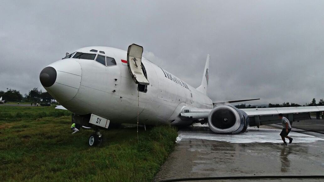 Dari sejumlah foto yang beredar di media sosial, tampak beberapa petugas tengah membantu melakukan evakuasi badan pesawat keluar dari landasan pacu. Tidak ada korban jiwa dalam insiden pesawat Trigana Air tergelincir ini.