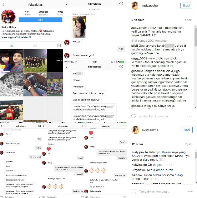 Di dalam screenshot percakapan yang diposting oleh Audy sendiri tersebut, terlihat Rizky pada mulanya mengajak kenalan Audy dengan baik-baik. Tetapi sesudahnya, Rizky justru mengutarakan kata-kata yang tidak pantas kepada Audy serta mengakui bahwa itu semua merupakan ulah mantan kekasihnya. Rizky pun minta maaf dengan peristiwa tersebut dan tidak ingin masalahnya diperbesar.