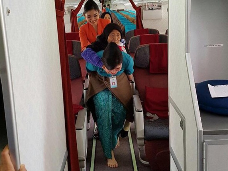 Penumpang yang digendong pramugari Garuda Indonesia bernama Vera itu baru saja pulang menjalankan umroh. “Setelah menunggu beberapa lama, kursi roda tak kunjung datang. Maka Ninik selaku Flight Service Manager dan pramugari Vera menawarkan pertolongan agar penumpang bisa secepatnya keluar dari pesawat,” ujar dia.