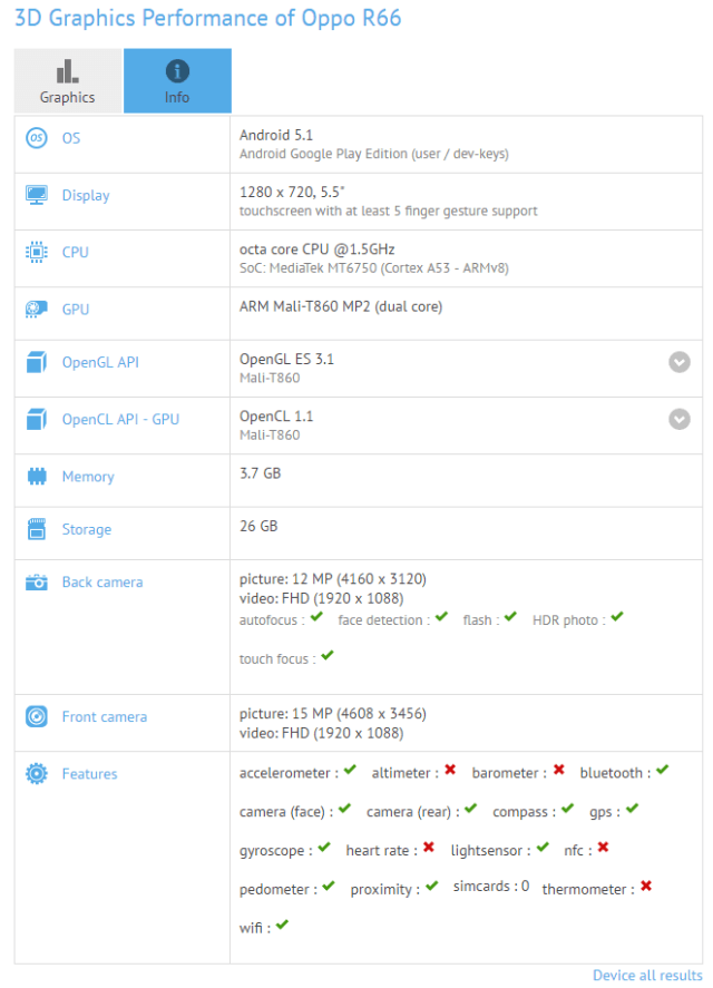 Sekarang, sebuah handset mid-range milik Oppo kembali terungkap di situs benchmark GFXBench. Dari sinilah, terungkap bagaimana handphone Oppo R66 ini akan membawa spesifikasi. Seperti halnya handset akan dikemas bentang layar 5,5 inci dengan menampilkan resolusi 1280 x 720 piksel (HD).