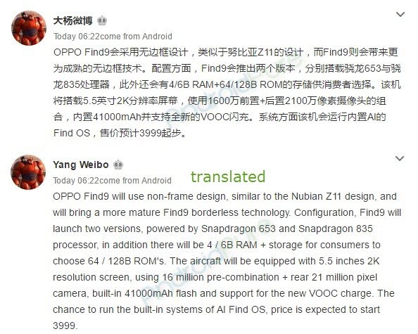 Selain itu, sempat dikabarkan bahwa Find 9 ini bakal menawarkan dua varian prosesor dengan spesifikasi berbeda, yakni varian Snapdragon 835 dengan konfigurasi RAM 6GB dan memori internal 128GB, dan varian Snapdragon 653 yang dipasangkan dengan RAM 4GB dan memori internal 64GB.