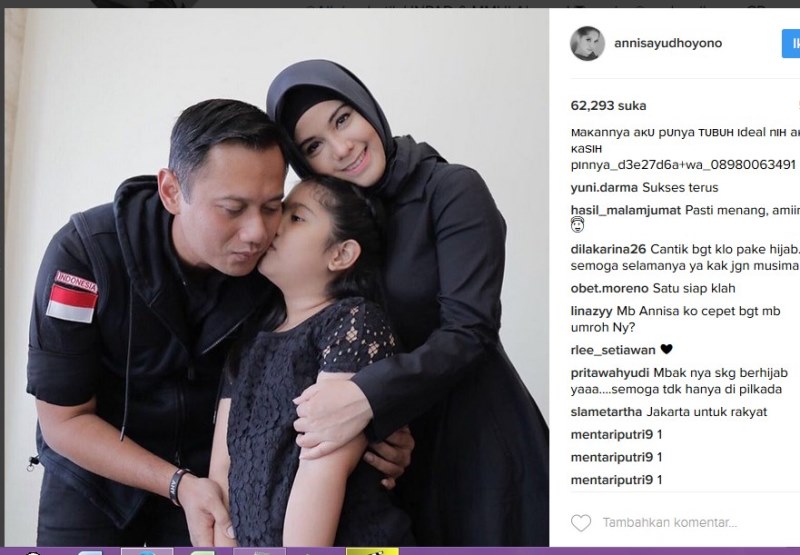 Sekarang ini tepat pada hari pencoblosan yang sudah dinanti-nanti, Annisa tampak mendukung sang suami dengan memposting sebuah foto keluarga dalam akun Instagram pibadinya, @annisayudhoyono.