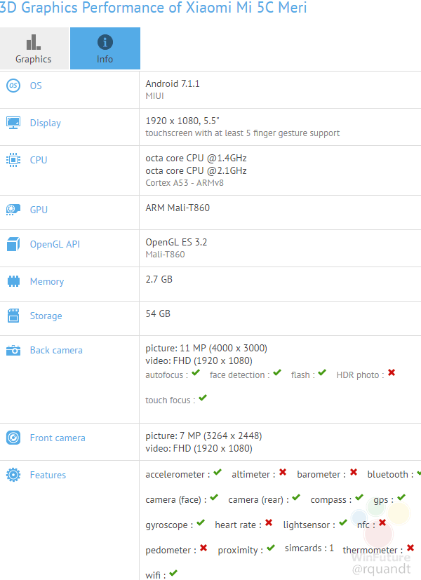 Sebelumnya, beredar bocoran gambar layar Xiaomi Mi 5C (MERI) yang menunjukkan handset akan ditenagai Snapdragon 821, dan memiliki RAM 4GB. Sementara situs sertifikasi di Cina, 3C justru menyebutkan bahwa Mi 5C akan dibesut Snapdragon 625.