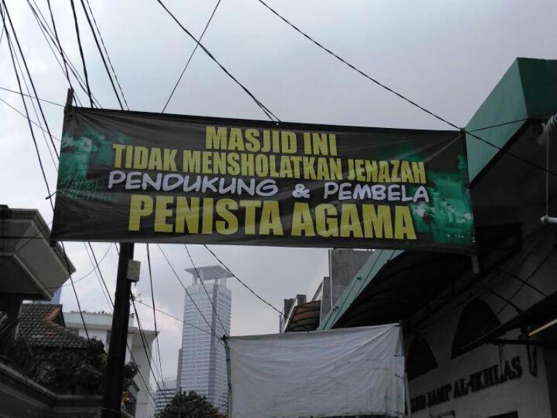 Sebelumnya, terpampang spanduk penolakan menshalatkan pendukung penista agama di sejumlah titik. Salah satu spanduk itu berada di sekitar Masjid Al-Jihad, Kelurahan Karet, Kecamatan Setiabudi, Jakarta Pusat. Spanduk itu diduga sebagai imbas dari adanya kasus penistaan agama yang dilakukan Ahok.