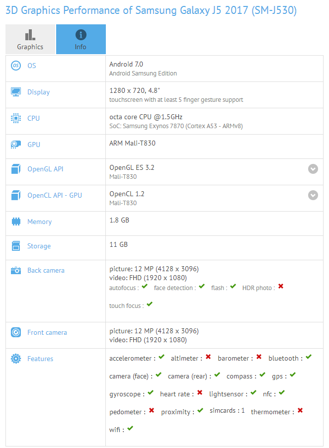 Samsung Galaxy J5 (2017) juga dilengkapi beragam sensor seperti terlihat pada laman benchmark GFXBench.