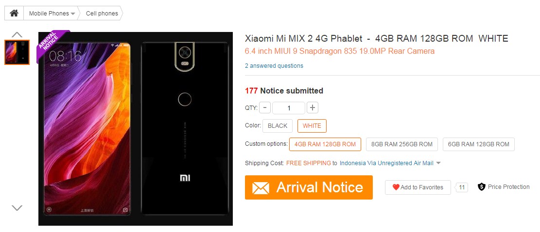 Pada laman di GearBest tersebut, Xiaomi Mi MIX 2 tampak hadir dengan beberapa perubahan, khususnya di sisi spesifikasi, meski rendernya masih acak-adut. Namun perlu diketahui juga, bahwa ini bukan pre-order, karena GearBest tidak minta konsumen membayar untuk memesan ponsel ini.