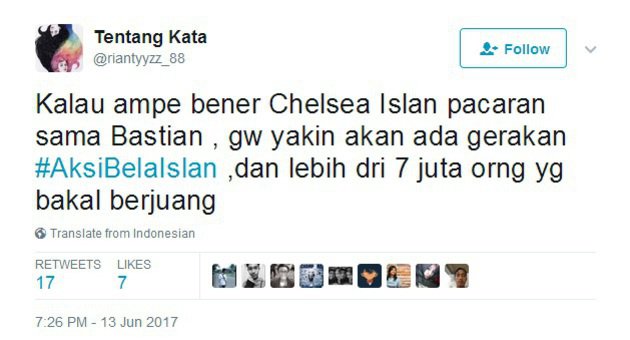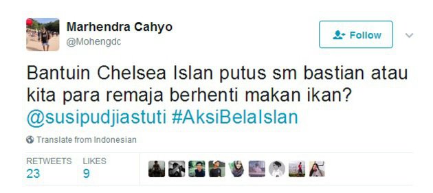 Saking patah hatinya, seorang netizen bahkan lapor kepada Menteri Susi serta mengancam jika Chelsea Islan tidak putus dengan Bastian para remaja akan berhenti makan ikan. Kocak banget nggak sih?