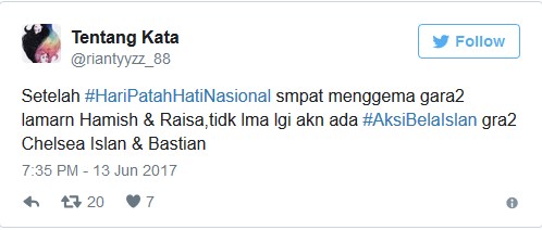 Setelah sebelumnya netizen ramai dengan hari patah hati nasional karena Raisa yang bertunangan dengan Hamish Daud, mereka juga menganggap bahwa hubungan asmara Chelsea Islan dan Bastian Steel sebagai hari patah hati nasional jilid 2 bagi mereka.