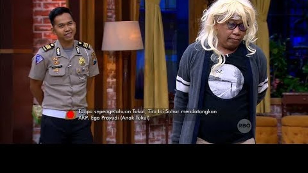Rupanya sejak tadi ia dilihat anak angkatnya yang jadi polisi, AKP Ega Paryudi, yang ada di belakangnya. Tukul yang tidak menyangka akan dikunjungi oleh anaknya pun langsung melepaskan wig blonde pada kepalanya, sembari membetulkan letak kacamatanya.