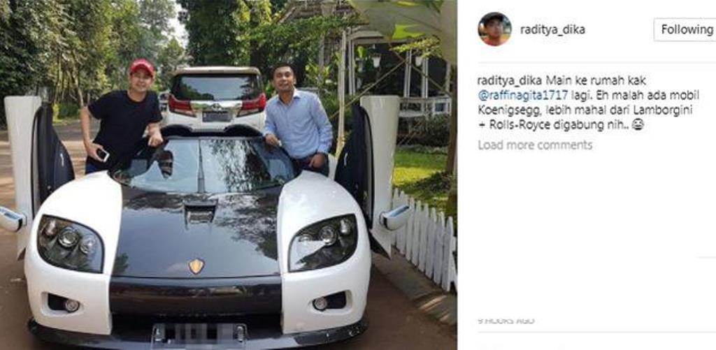 Di dalam akun Instagram, komika yang juga merupakan film maker, Raditya Dika terlihat kagum dengan mobil baru ayah satu orang anak tersebut. Ia pun menaksir mobil Koenigsegg dari Raffi Ahmad ini seharga miliaran rupiah..