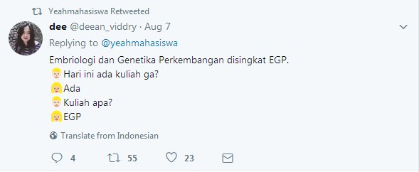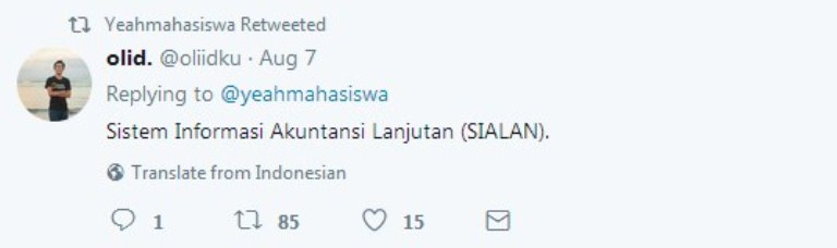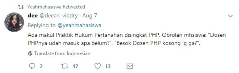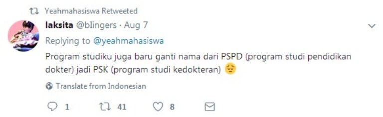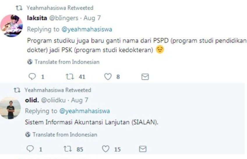 Dalam cuitannya yang diunggah pada tanggal 7 Agustus itu ia menuliskan, “Tata Usaha dan Dosen susah-susah ngasih nama mata kuliah, mahasiswa nyingkatnya seenak jidat.”
