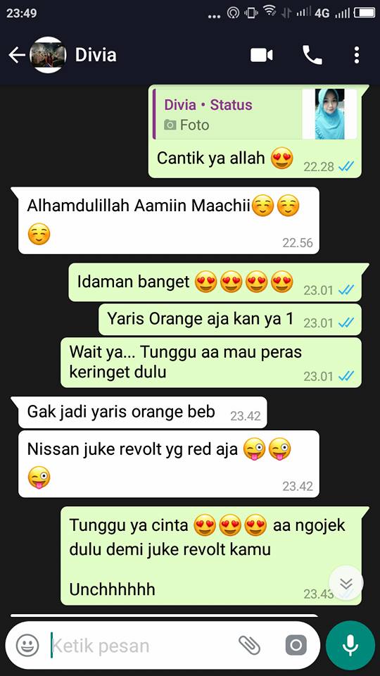 “Bro doain aingx ya buat nikahin bebep aingx tahun depan… Target mahar nya Nissan juke revolt tapi insyaallah ke kejar deh pake 3 aplikasi ojek online sama taxi online… Demi bebep aingx 😍😍😍😍😍”