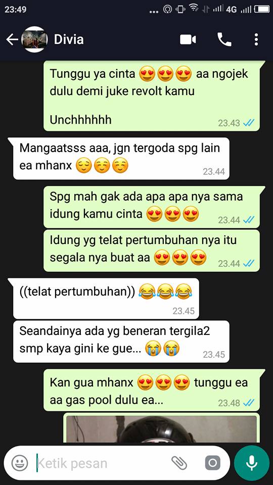 Wait ya… Tunggu aa mau peras keringet dulu”, lanjut Bayu mengirim pesan pada Divia.
