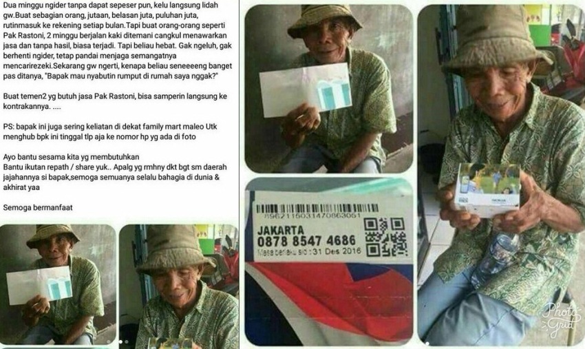 Postingan itu berkisah tentang seorang kakek bernama Rastoni (65) yang masih giat bekerja demi mendapat uang untuk biaya hidup dirinya dan keluarganya.