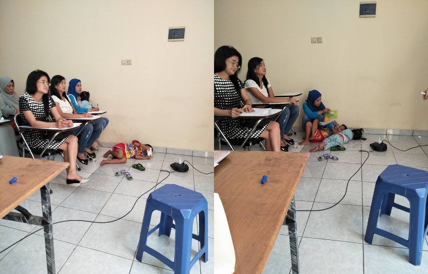 Bukan hanya menggendong sang anak sambil mendengarkan materi diskusi, tapi ibu yang penuh kasih sayang itu juga mengipasi anaknya yang sedang tertidur diatas lantai.