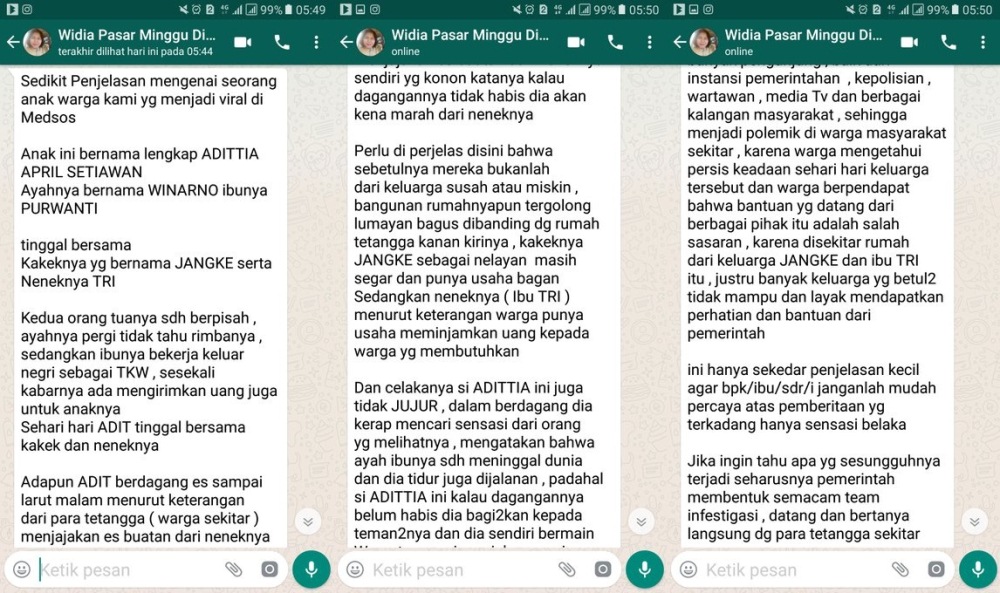 Ini hanya sekedar penjelasan kecil agar bapak/ibu/saudara/saudari jangan mudah percaya atas pemberitaan yang kadang hanya sensasi. Masih banyak keluarga lain yang lebih layak mendapatkan bantuan dan perhatian”, tulis Widia, seorang yang isi pesan WhatsApp-nya dibagikan oleh Dinsos DKI Jakarta.