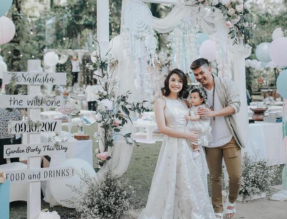 Salah satunya yakn foto keluarga yang berpose di depan dekorasi pesta ulang tahun dari Nastusha. Pesta yang dilaksanakan di luar ruangan ini dipenuhi dengan ornamen dominan warna putih serta sentuhan warna biru muda.