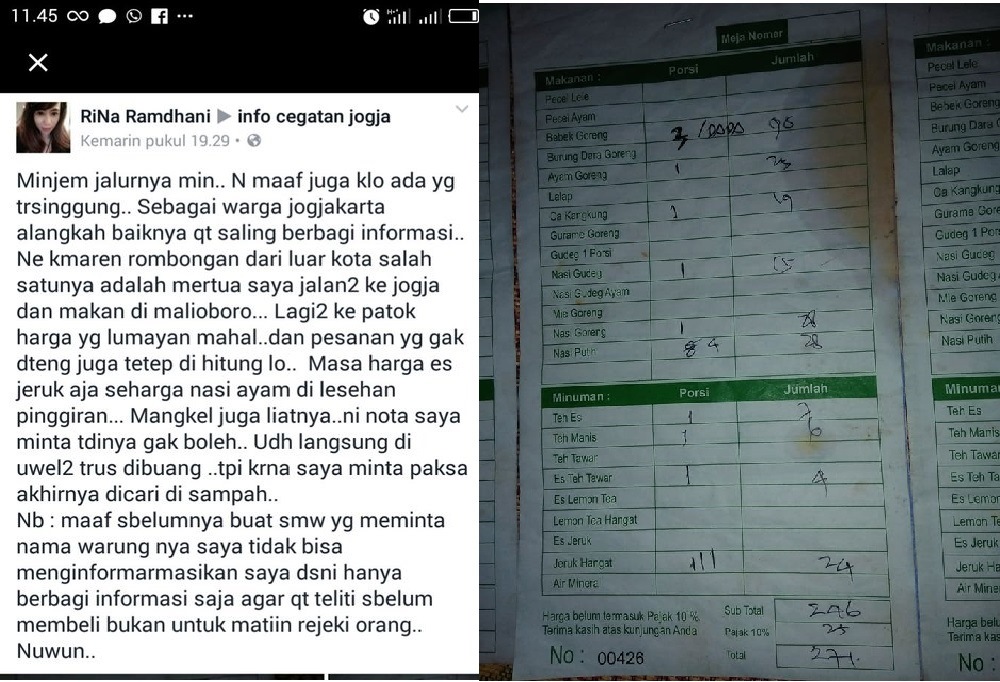 RANCAH POST – Lagi, modus penjual makan lesehan di Malioboro dengan harga tinggi kembali terjadi. Sebuah akun facebook yang bernama Rina Ramdhani membagikan cerita serta keluhannya tentang buruknya pelayanan serta mahalnya harga makan lesehan di Malioboro Yogyakarta tersebut.