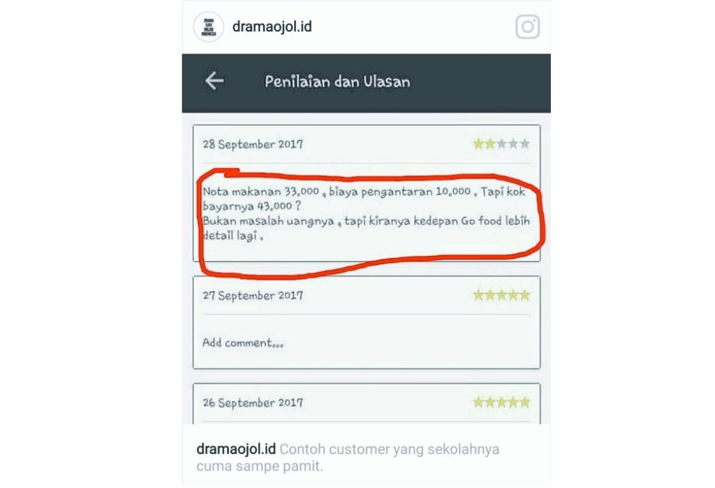 Seperti belum lama ini Instagram @dramaojol.id mengunggah foto-foto tentang penilaian dan ulasan dari para customer tentang pelayanan ojek online.