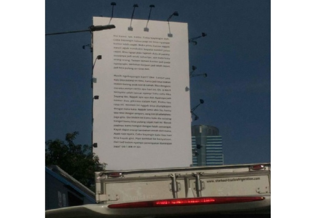 Namun baliho raksasa ini justru berhasil menarik perhatian netizen. Jika biasanya iklan itu menggunakan bahasa yang singkat, ini justru menggunakan kata-kata yang bahkan cukup untuk satu lembar cerita.