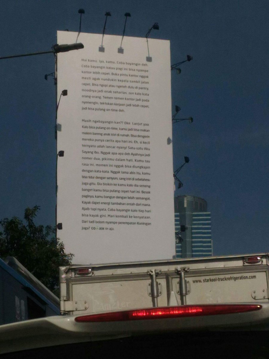 Hal ini juga dilakukan oleh salah satu perusahaan penyedia jasa ojek online yang berasal dari Indonesia ini. Mereka menggunakan promosi dengan cara memasang baliho raksasa.