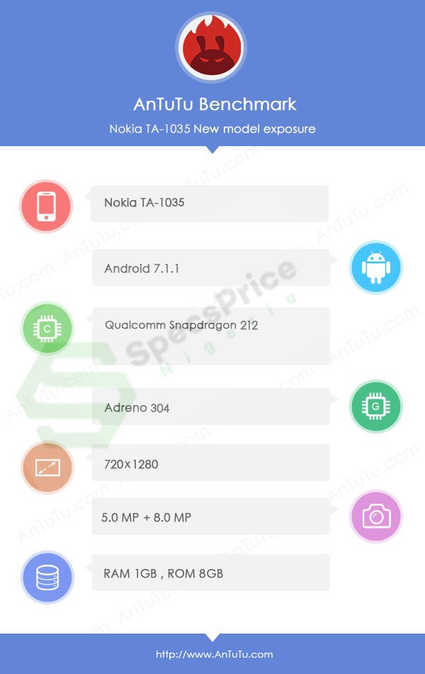 Adapun Nokia 2 sendiri muncul di AnTuTu dengan nomor model TA-1035.