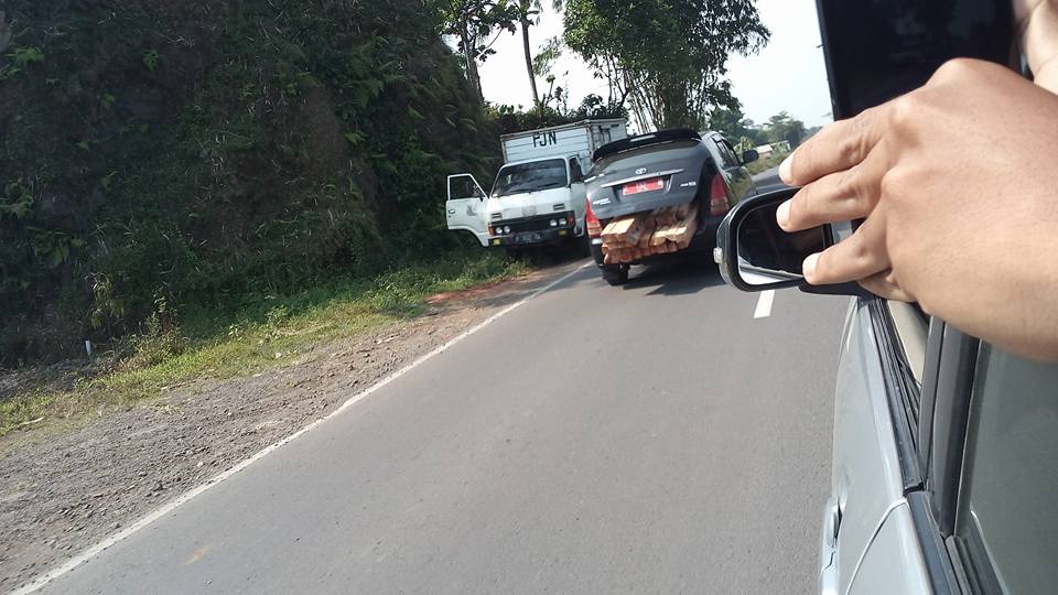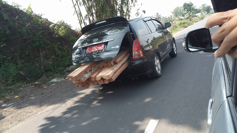 Betapa tidak, mobil dinas tipe Kijang Innova itu dipaksa membawa beberapa balok kayu usuk di bagasi. Karena bukan mobil angkutan barang, alhasil kayunya pada nolol keluar.
