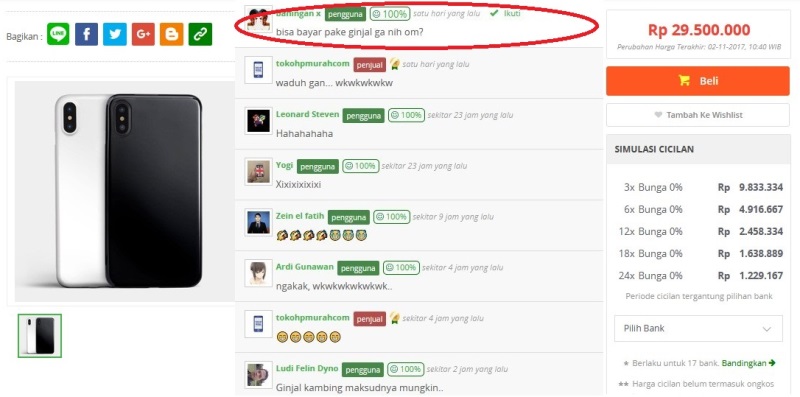 Tanpa tedeng aling-aling ia bertanya, “Bisa bayar pake ginjal ga nih om?“. Melihat pertanyaan seperti itu, seller pun dibuat bingung sekaligus ketawa ngakak dalam komentarnya.