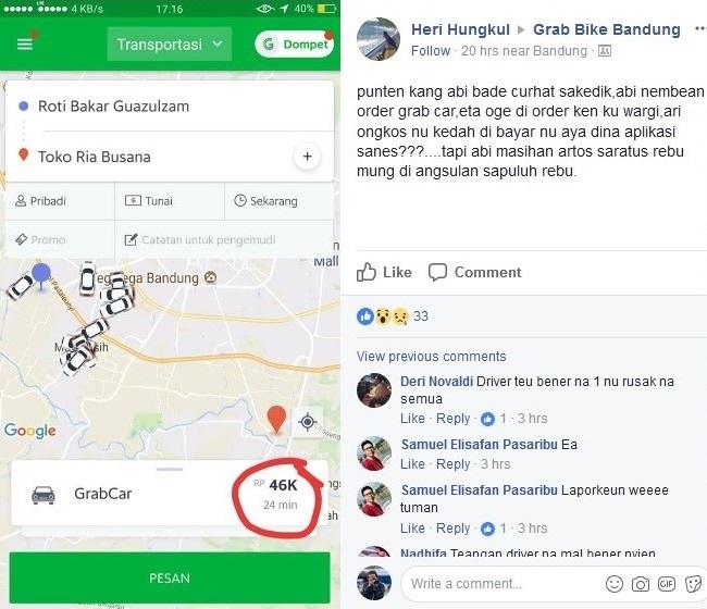 Netizen bernama Heri Hungkul memposting di sebuah grup Facebook bernama Grab Bike Bandung pada hari Jum’at (3/11). Dalam penuturannya, ia mengaku baru pertama kali naik taksi online Grab Car.