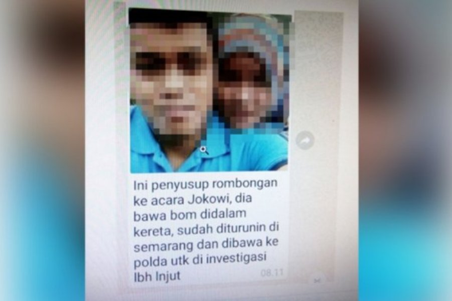 “Ini penyusup rombongan ke acara Jokowi, dia bawa bom di dalam kereta, sudah diturunin di Semarang dan dibawa ke polda untuk investigasi lbh lanjut,” tulis keterangan di bawah foto tersebut.