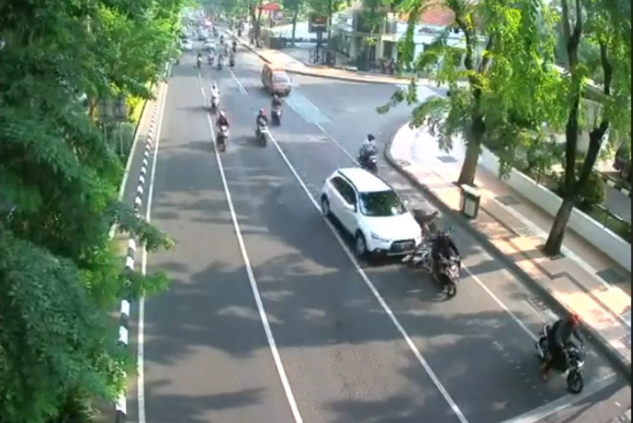 Sesaat kemudian terlihat mobil berwarna putih yang melaju cukup kencang menyeruduk pengendara motor hingga terpental. Kecelakaan di Darmo pun sempat membuat lalu lintas mengalami kemacetan.