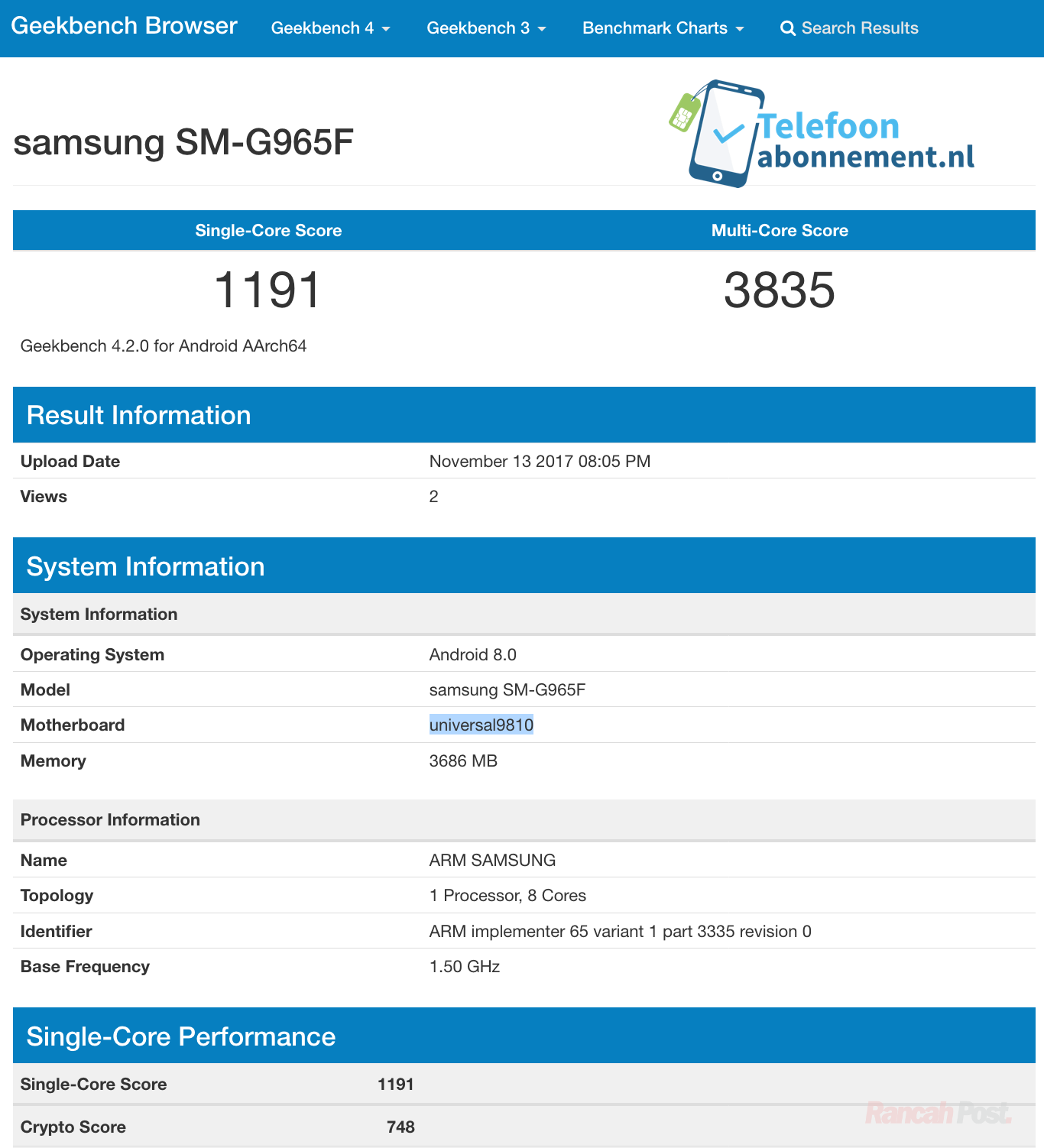 Menurut Geekbench, Samsung Galaxy S9 Plus (SM-G965F) ini berjalan pada sistem operasi Android 8.0 Oreo, didukung chipset ‘universal9810‘ atau chipset anyar perusahaan yang baru saja diumumkan, Exynos 9810.