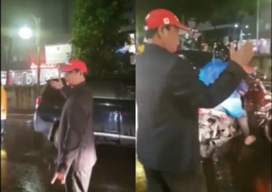 Dari video dengan durasi sekitar 53 detik, terlihat seorang pria bertopi merah yang turun ke jalan untuk mengatur lalu lintas.