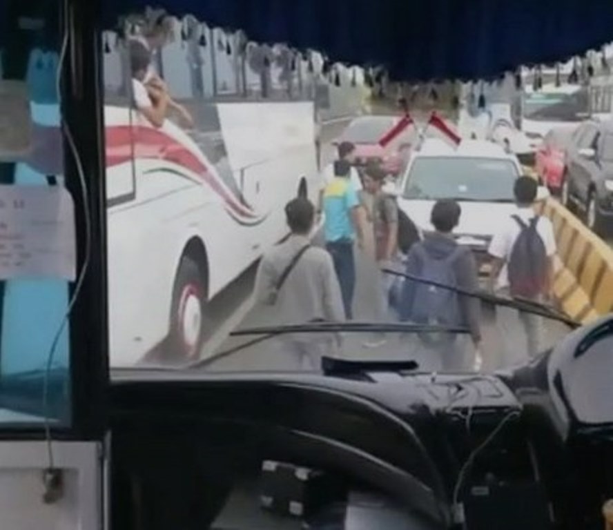 Bis yang terhalangi jalannya pun terpaksa harus berhenti karena jalanan yang padat. Karena geram, penumpang bis tersebut pun turun dan memaksa mobil tersebut untuk mundur.