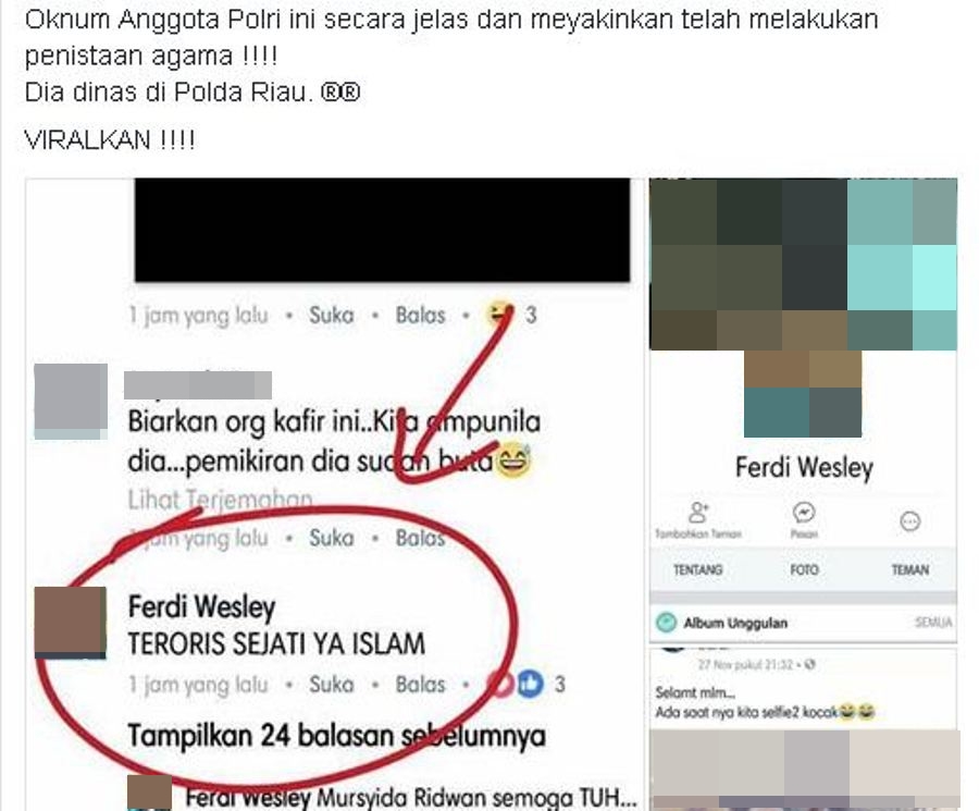 RANCAH POST – Seorang netizen dengan akun Rudy Razi menyebut bahwa akun dengan nama Ferdi Wesley yang disebutnya sebagai oknum anggota polisi dengan jelas melakukan penistaan agama.