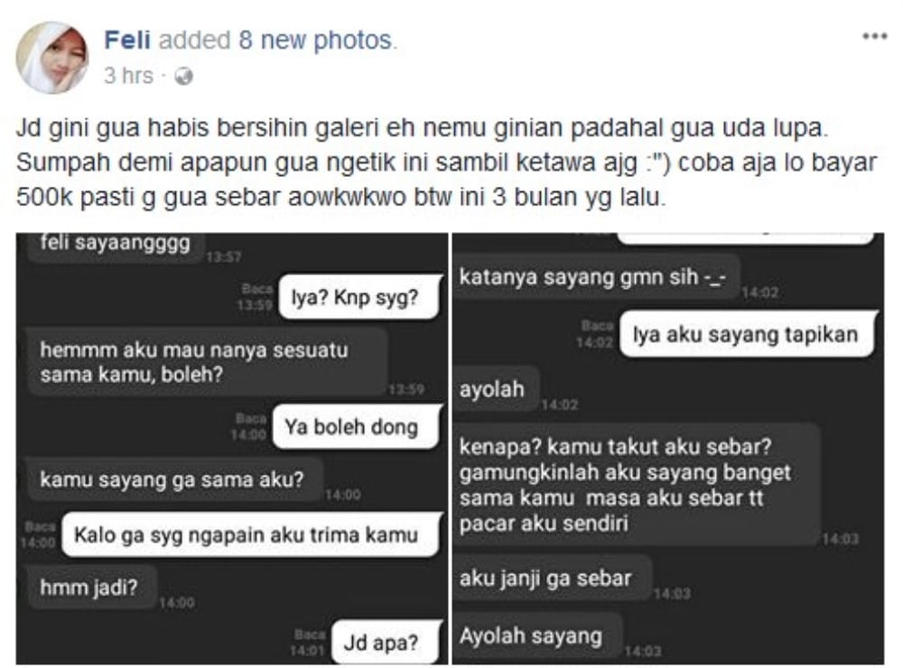 Dalam unggahannya, Feli menyertakan caption, ‘Jd gini gua habis bersihin galeri eh nemu ginian padahal gua uda lupa. Sumpah demi apapun gua ngetik ini sambil ketawa ajg :”) coba aja lo bayar 500k pasti g gua sebar aowkwkwo btw ini 3 bulan yg lalu.‘