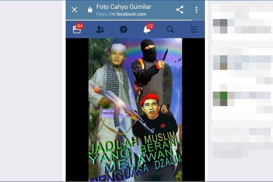 Di samping pria berbaju putih itu terlihat seseorang yang berpakaian serba hitam mengacungkan belati sembari memegang baju pria berbaret merah yang mirip dengan Presiden Joko Widodo.